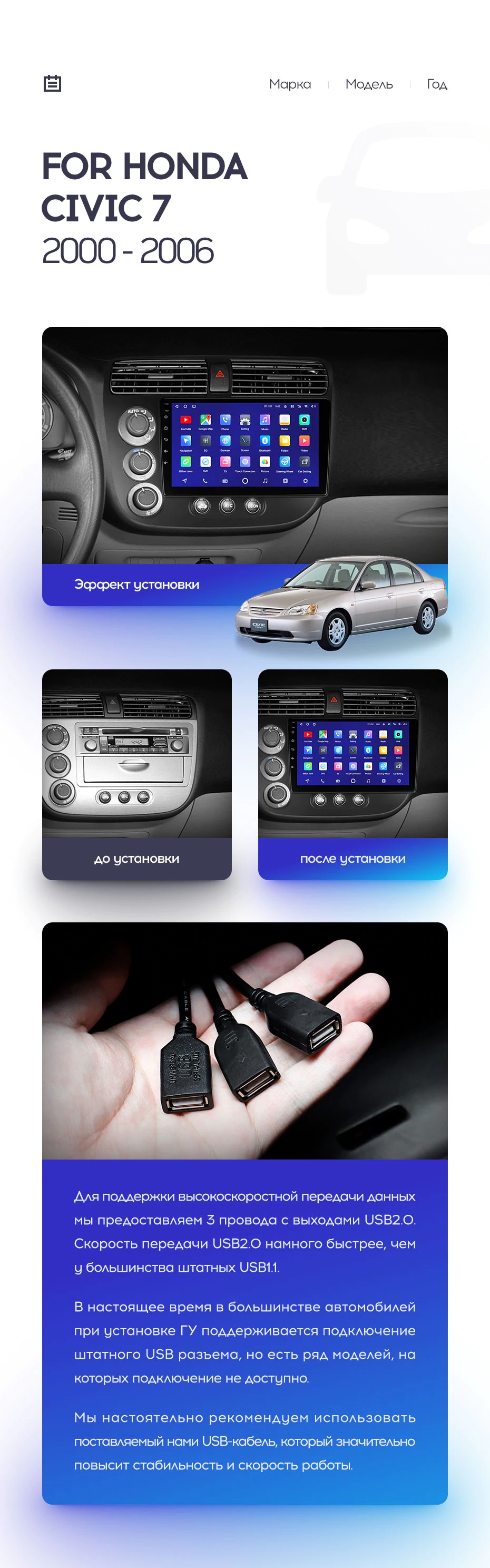 Полный комплект установки магнитолы Teyes с рамкой и проводкой можно выбрать в каталоге штатных магнитол Honda Civic 7 (2000-2006).