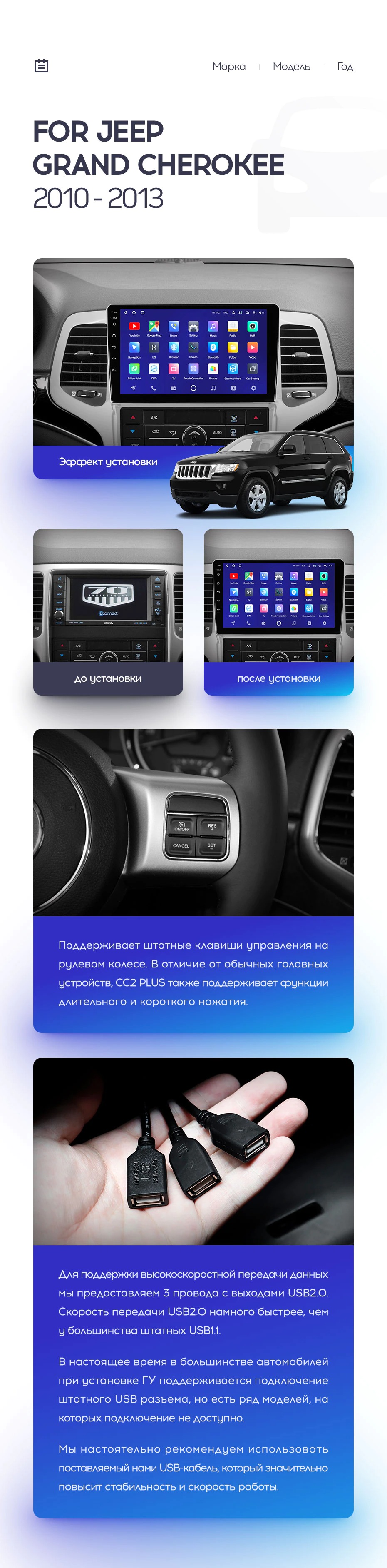 Установочный комплект для Jeep Grand Cherokee WK2 (2010-2013) включает переходную рамку и проводку.