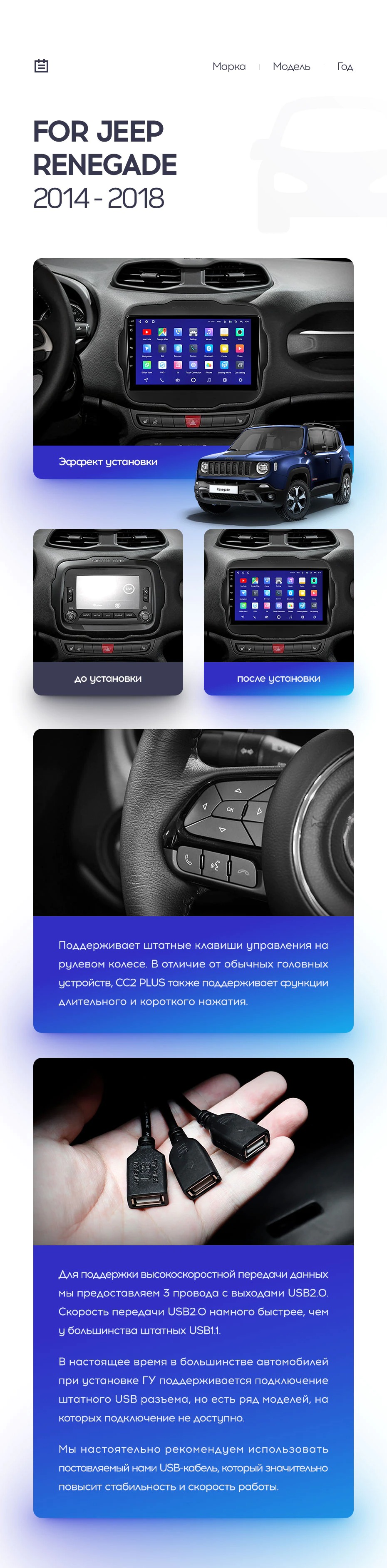 Полный комплект установки магнитолы Teyes с рамкой и проводкой можно выбрать в каталоге штатных магнитол Jeep Renegade (2014-2018).