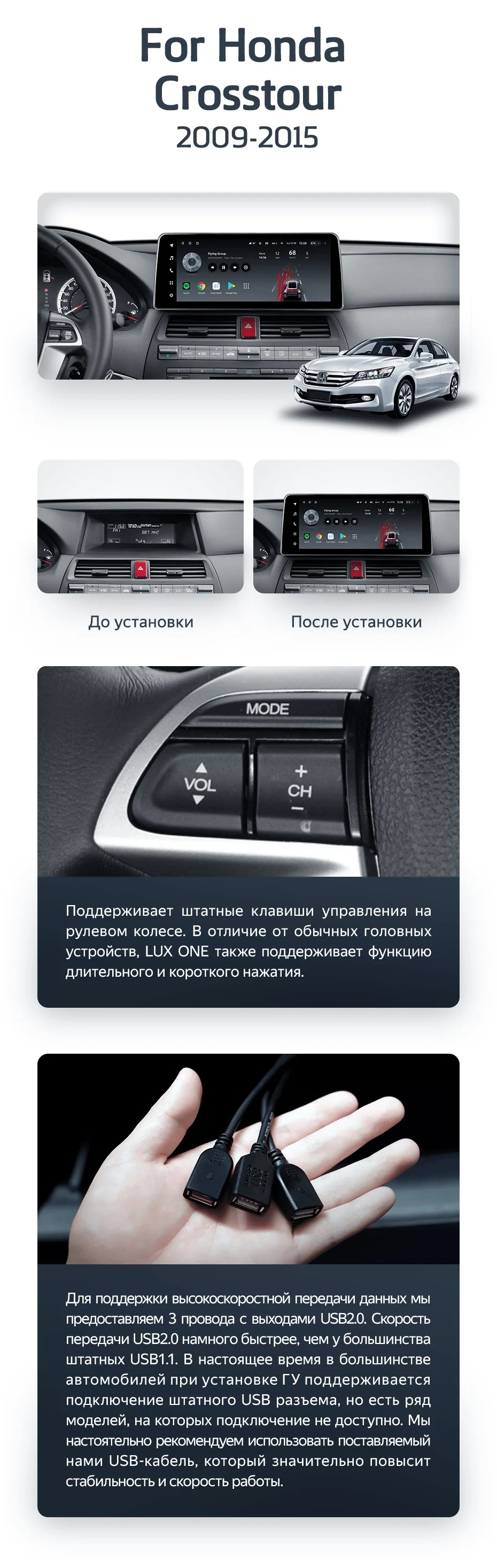 Полный комплект установки магнитолы Teyes с рамкой и проводкой можно выбрать в каталоге штатных магнитол Honda Crosstour 1 TF (2009-2015).