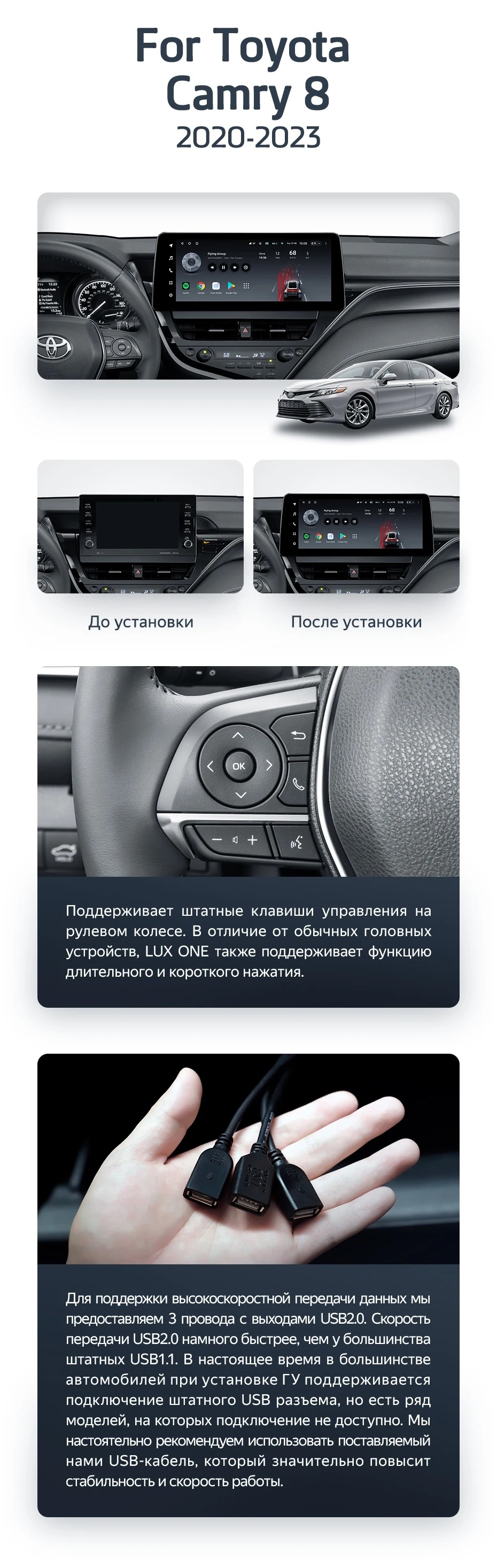 Полный комплект установки магнитолы Teyes с рамкой и проводкой можно выбрать в каталоге штатных магнитол Toyota Camry 8 XV70 (2020-2023).